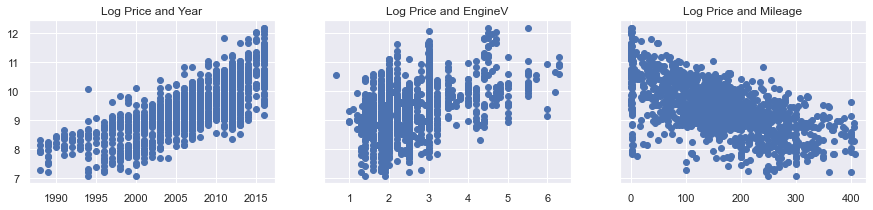 ax2.set_title('Price and EngineV')ax3.scatter(data_cleaned['Mileage'],data_cleaned['Price'])