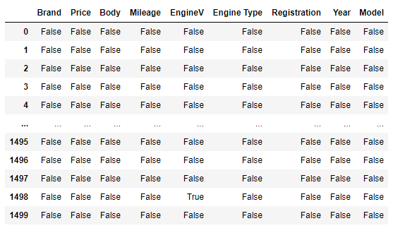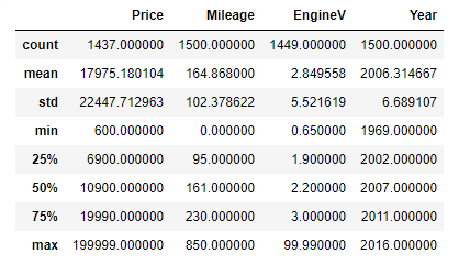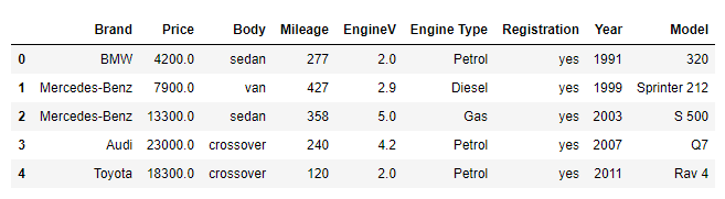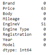 D’après le résultat, les variables Price et EngineV on des valeurs null. Il existe plusieurs méthodes pour traiter les valeurs null, l’une d’entre elles est d’utiliser la classe SimpleImputer ou IterativeImputer de la bibliothèque Scikit-learn.Nous allons seulement supprimer les valeurs null dans notre cas. Ce n’est pas toujours recommandé de supprimer les valeurs null, cependant si les valeurs null représentent moins de 5% du l’ensemble de données ce n’est pas un problème considérable.