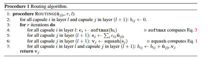 Figure 1 : Procédure Algorithme de routage par accord (Source: Capsule Network paper: https://arxiv.org/abs/1710.09829)