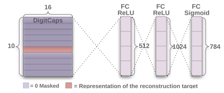 Explication de Figure 3 : Structure du décodeur pour reconstruire les données à partir de la représentation de la couche DigitCaps. La distance euclidienne distance euclidienne entre l’image et la sortie de la couche Sigmoïde est minimisée pendant l’apprentissage.